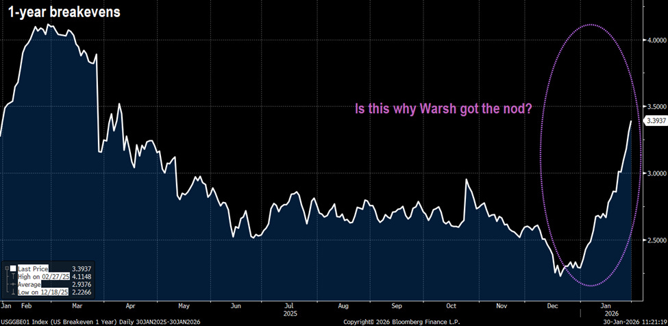 Why have I bored you with all this? Well, it’s because POTUS has finally picked a new Fed chair and markets think he made a (comparatively) hawkish choice. Anna Wong had a particularly popular take on this. Far be it for me to contradict Anna, who is generally a good call on matters macro, but I struggle to believe that Warsh is going to be significantly more hawkish on inflation than other candidates. I think the administration has already amply demonstrated its conviction that US productivity growth will remain elevated, and that policymakers shouldn’t be too worried about inflation over the medium term.