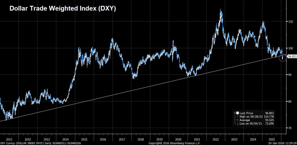 So perhaps Warsh was a tactical choice, designed to rein in the idea that the dollar is a one-way bet. We now have a FOMC Chair in-waiting who will (ostensibly) prioritise reducing inflation and bringing down the Fed’s balance sheet, if we rely on his past public statements. And perhaps that will be enough to bring mortgage rates down.