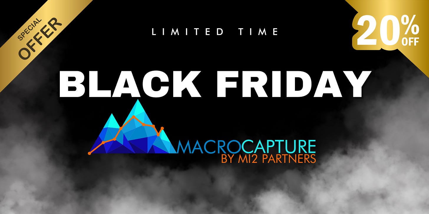 If you’ve been thinking about taking your macro process to the next level, now’s the moment. For Black Friday, we’re offering 20% off an annual MacroCapture subscription—giving you full access to MI2’s actionable market insights, strategic frameworks, and timely updates that keep investors ahead of major shifts.