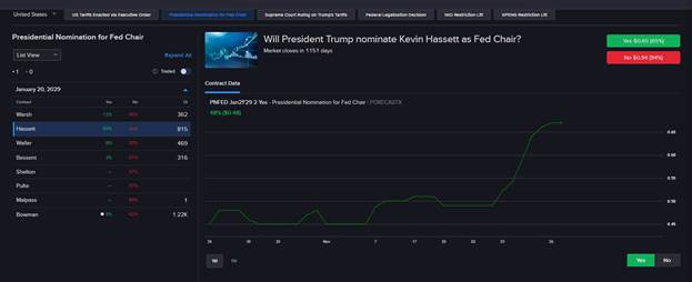 To our mind, the main question left to be resolved is whether Powell will break with tradition and stay on the board when his term as Chair is over, or leave the Board (freeing up another seat for a Trump candidate). Our suspicion is that he has not decided yet. We have no doubt in our mind that given his druthers, Powell would rather be anywhere else but we suspect his loyalty to the Fed as an institution, and his lunch buddies mean that he will try to lobby for the Fed’s preferred candidates, which we suspect would be Waller, Bauman or Hassett. Most people think it will be Hassett (we hear even Waller doubts he will get the job), and if it is, Powell will ride off into the sunset. Happy Holidays!