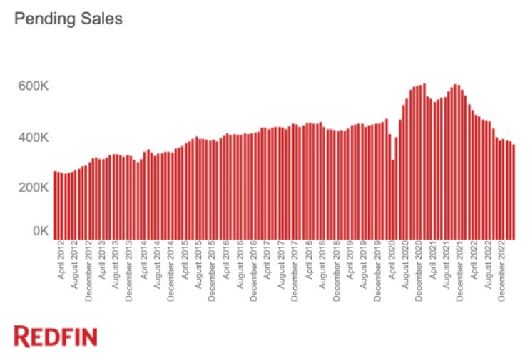 In another real estate-related twist, Redfin noted that the median home sales price dropped 3.3% YoY, “the largest year-over-year drop since 2012”. The Redfin report went on to explain that “pandemic boomtowns and pricey Bay Area markets led the price declines”, with Boise, ID taking the “top” spot among the metro areas with a 15.4% drop. A real estate agent quoted in the report offered some color: “There’s this fear that everything will crash. There are bank failures, inflation, recession fears, mortgage-rate volatility, a war in Ukraine, spy balloons—some people are wondering if they should pull their money out of the bank and park it in a safe rather than spend it on a new home.”